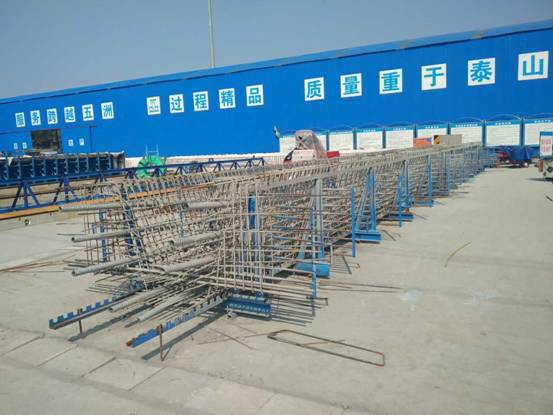 預制梁場建設自動噴淋養生設施,大大提高了養生質量,節約了勞動力。預制小箱梁采用組合式臺架進行鋼筋綁扎,大大提高了鋼筋綁扎質量,并申請專利2項。