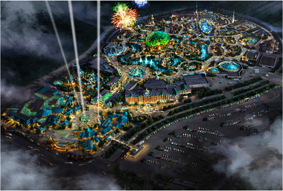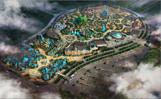 With the total floor space of 424.7 thousand square meters and a total building area of about 300 thousand square meters, including 236 thousand square meters above ground and 64 thousand square meters underground, the Project is composed of off-park business zone and theme park. The Project mainly includes six venues, commercial facilities, theme hotels, logistic service rooms and amusement facilities etc。