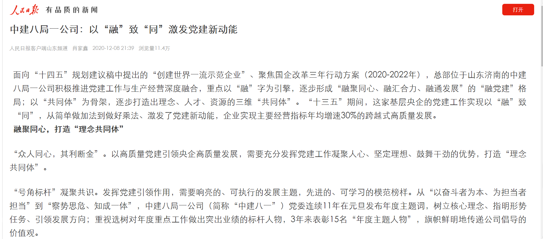 12月8日,《人民日報》客戶端以《中建八局一公司:以“融”致“同”激發黨建新動能》為題,全文刊發公司“融黨建”工作的經驗做法,瀏覽量很快突破10萬+。